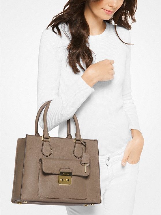 Sử dụng da Saffiano cao cấp, chi tiết khóa và chìa khóa vàng đồng đẳng cấp.